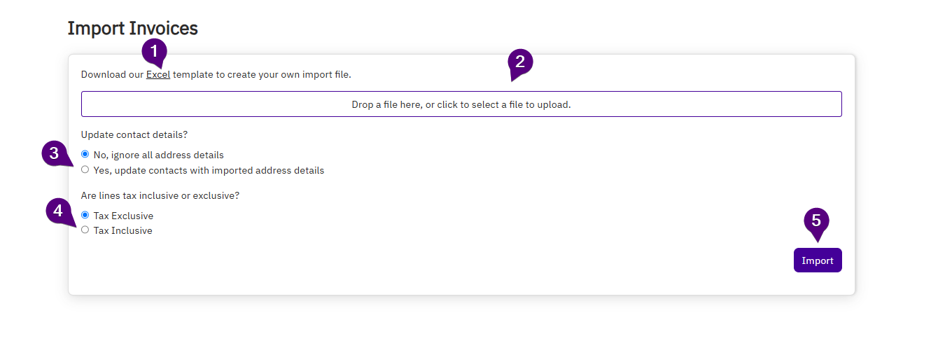 - Click Import to open the upload screen. Choose the Excel option to download the invoice template.