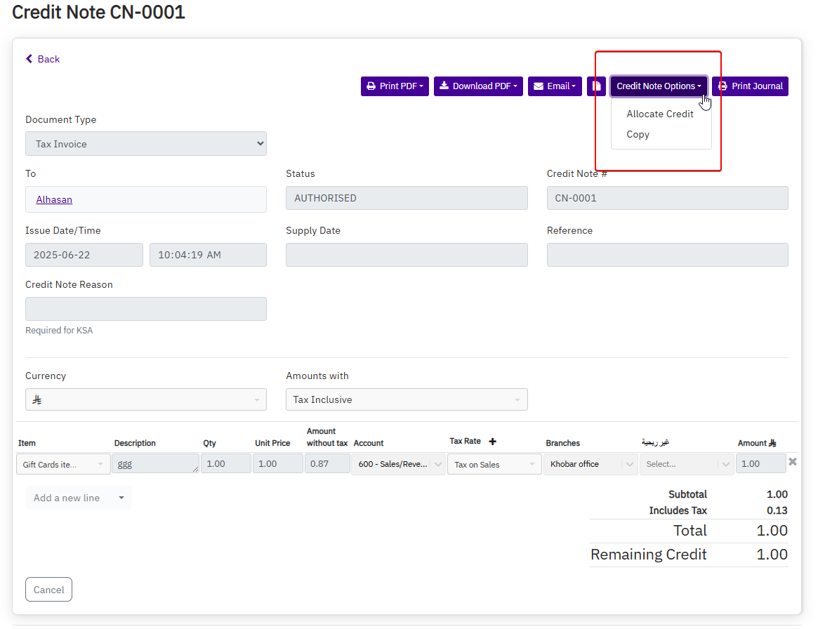 - Save: saves the credit note as a draft