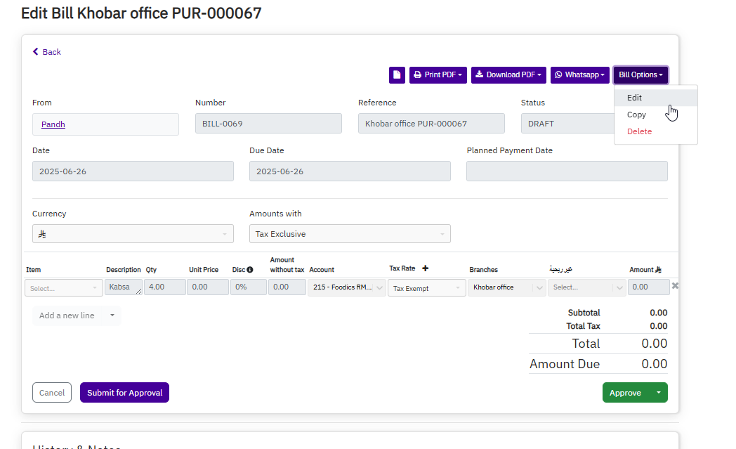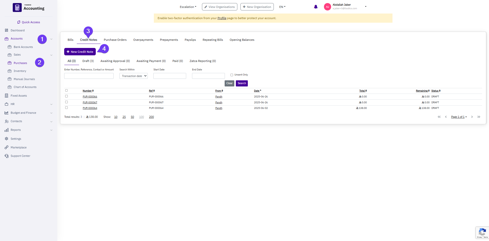 How to create Credit Notes for Purchases Invoices in Foodics Accounting