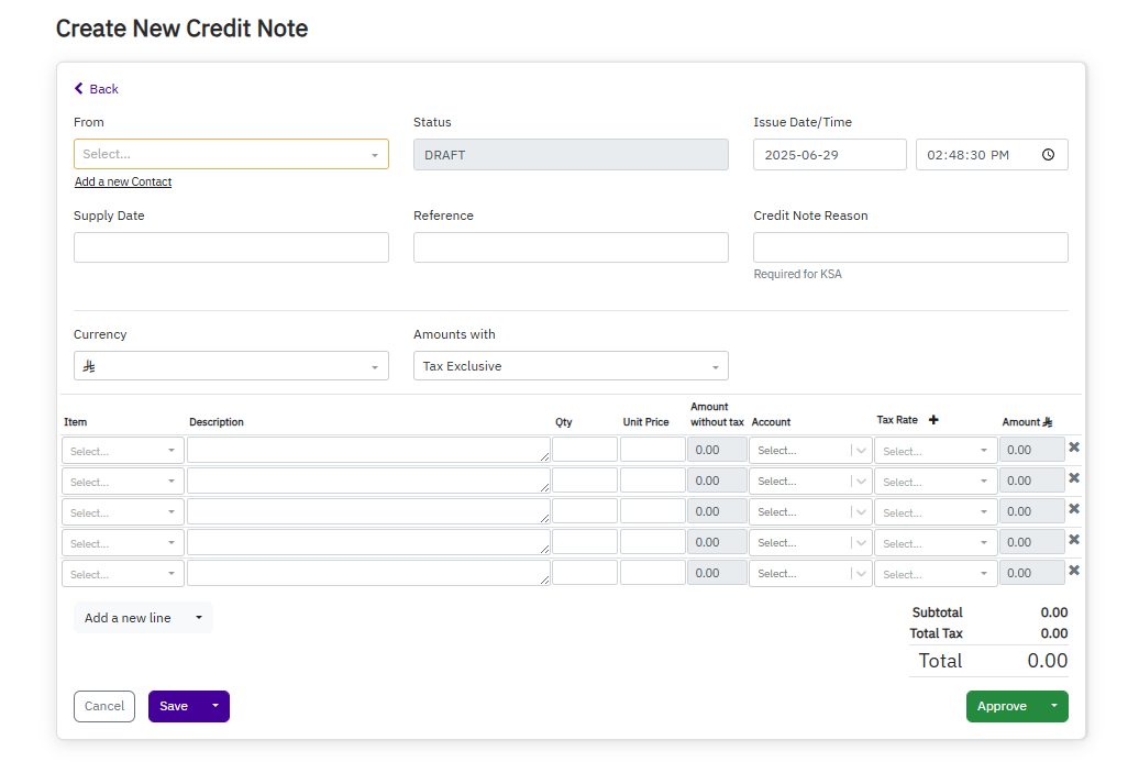- Navigate to Purchases > Credit Notes > New Credit Note
