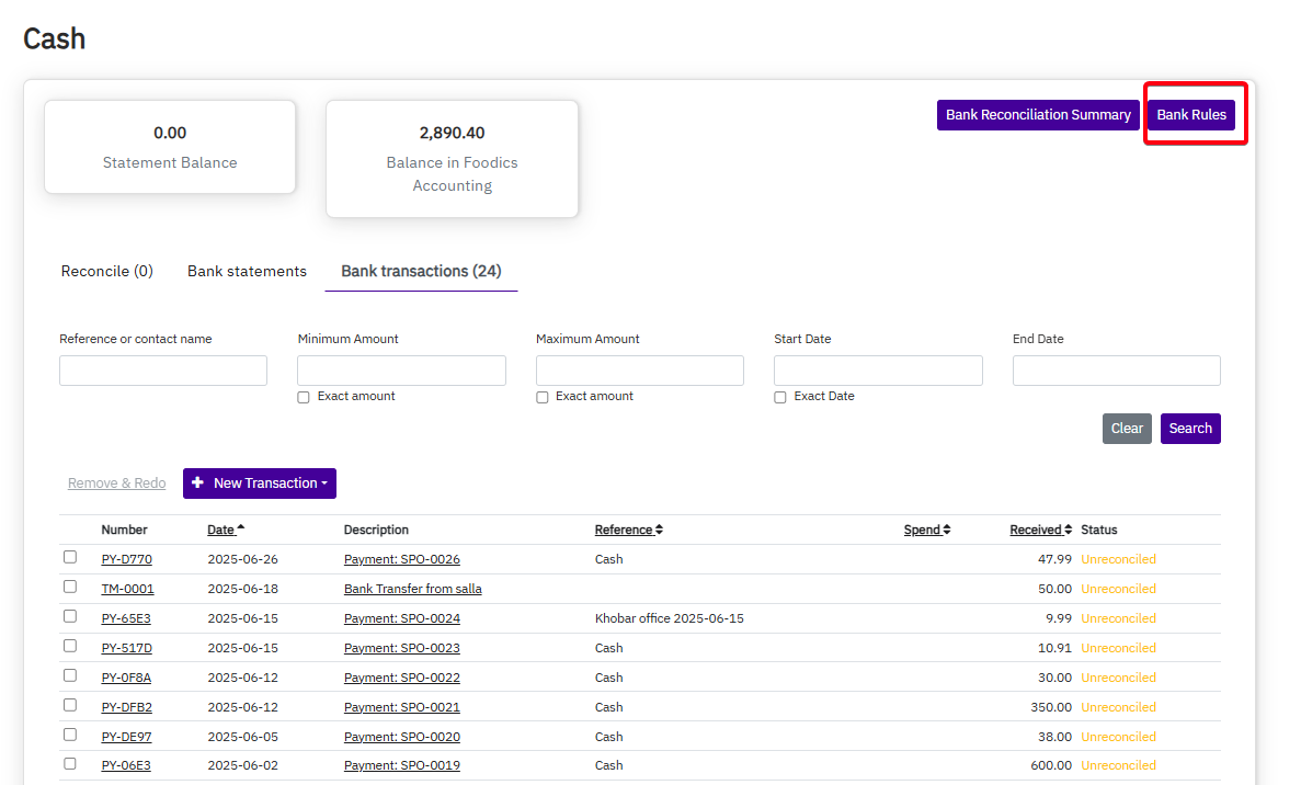 The system allows you to create bank rules for your POS through the Bank Rules section to: