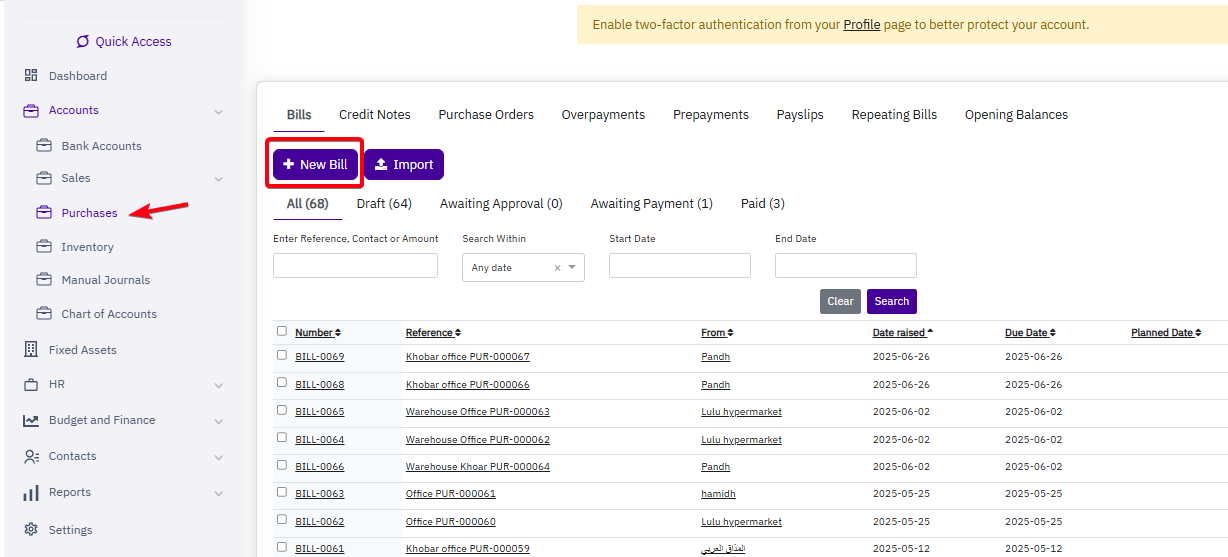 Accounts > Purchases > New Bill