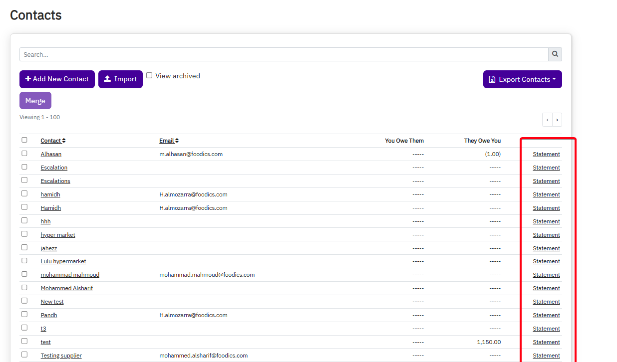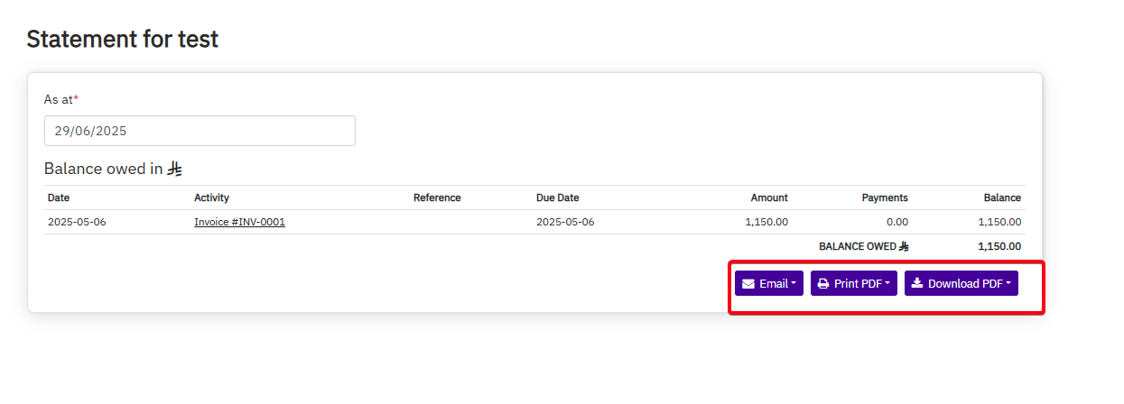 - The Account Statement section will display the detailed statement for the selected supplier/customer. You can print the statement, download it as a PDF, or send it via email.