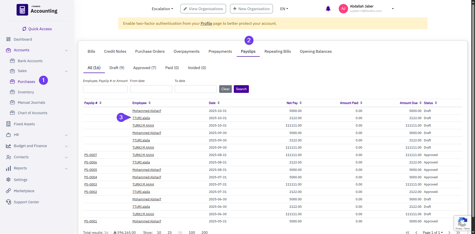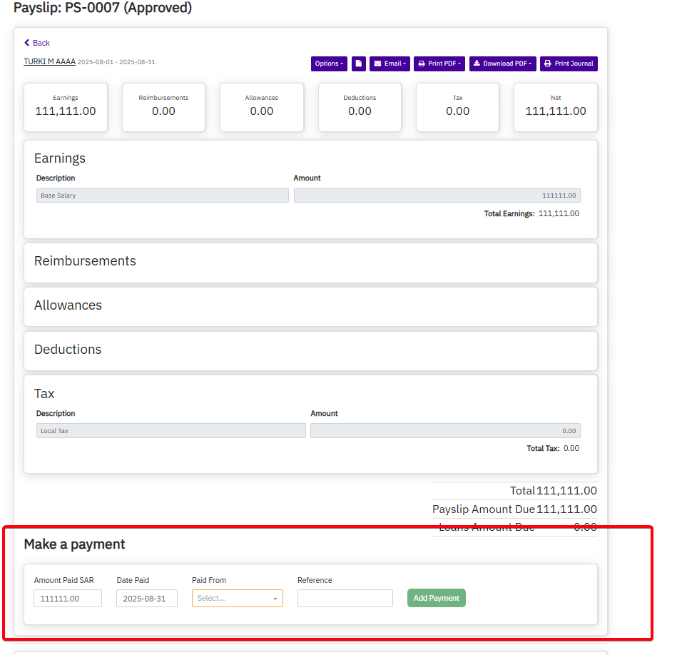 - Click Save to apply updates, which will reflect in the Payslips section under Purchases.