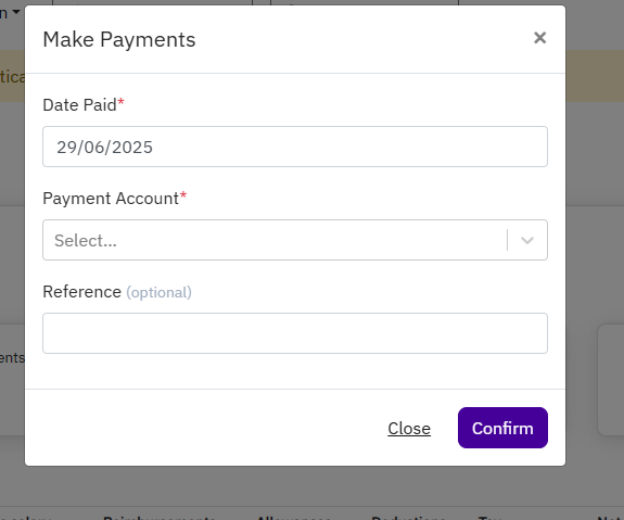 - Select the payment date and the bank account to be used for payment, then click Confirm.