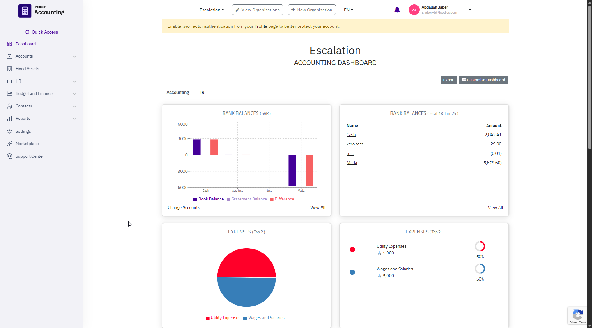- Bank Balances for up to 10 accounts are displayed, showing each account's balance in the Foodics Accounting System. Clicking "View All" will redirect you to the Bank Accounts screen.