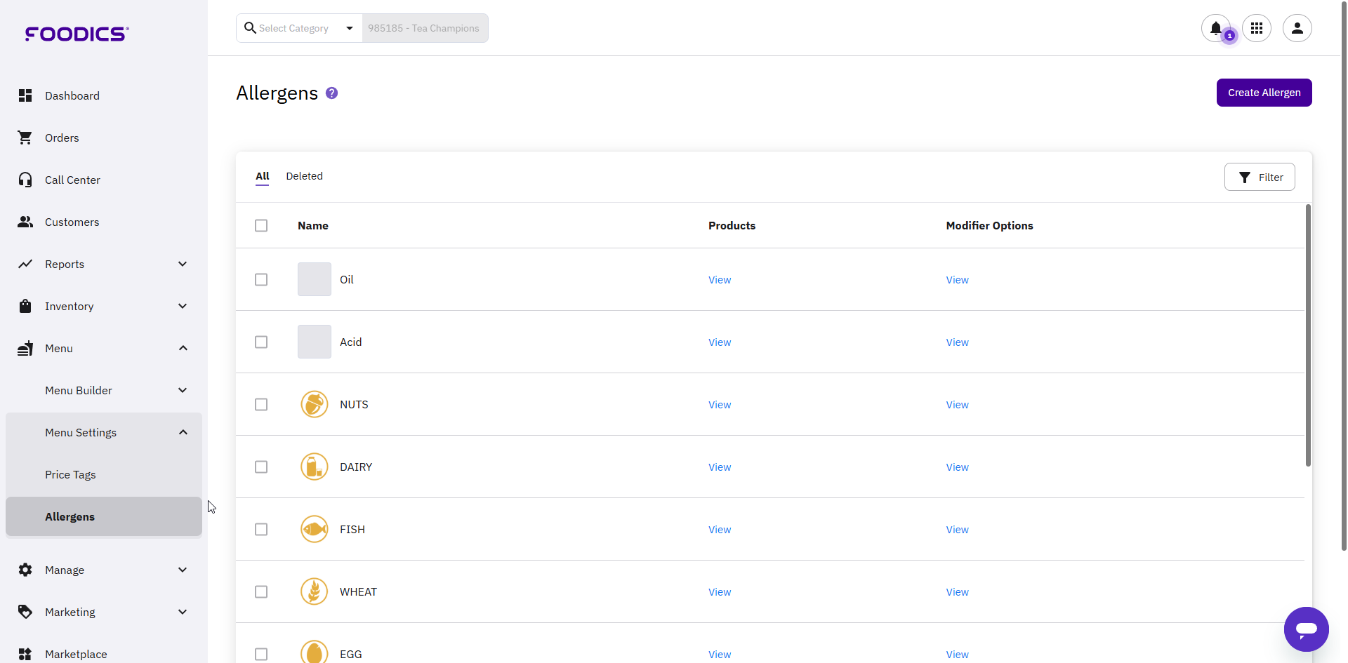 You can find in Foodics RMS Console page, under Menu > Menu Settings > Allergens the options to add and control your food allergens.