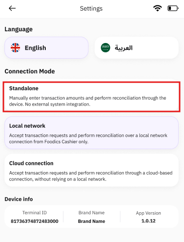 This mode allows you to manually enter the transaction amount directly from the terminal, without integration with Foodics Cashier.