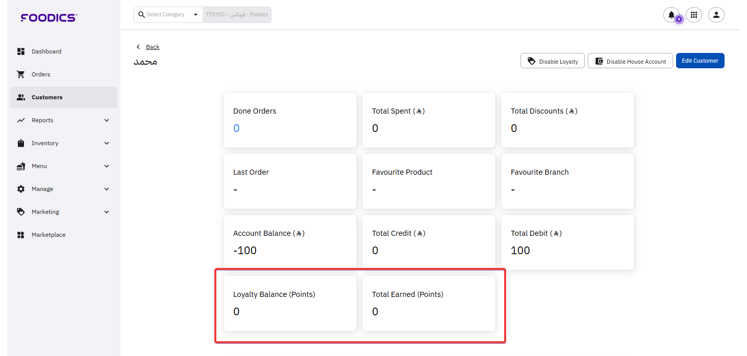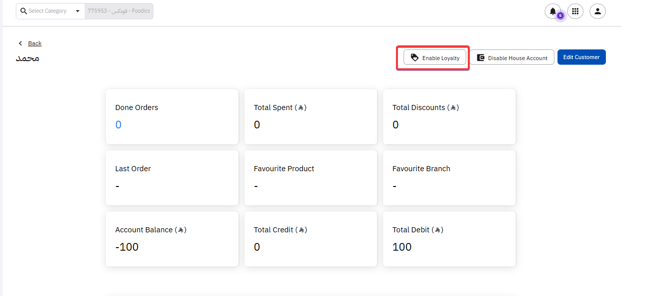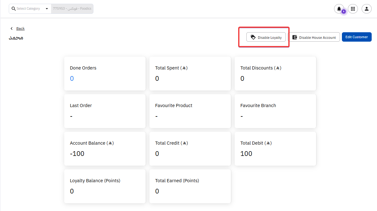 To disable the loyalty, you will find the button in the same location on the top of the customer's profile.