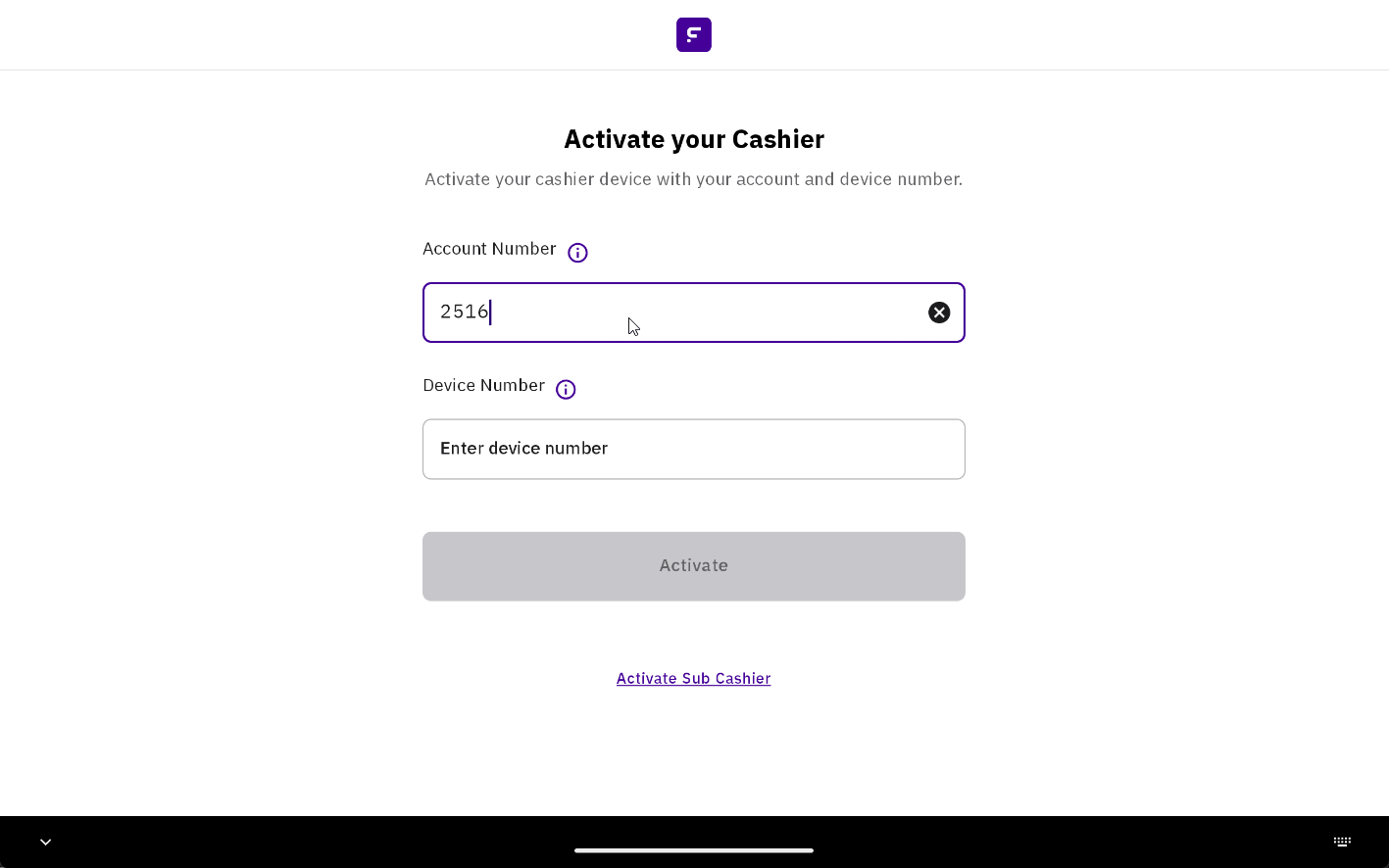 5. Enter the cashier's pin code. When logging in for the first time as the account owner, the default Cashier pin is 12345; If you are logging in as an authorized user, the cashier pin must be created from the Console (Click here to learn how to create a Cashier's Pin).