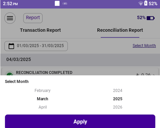 - Select a date range (month-year) to filter reconciliations.