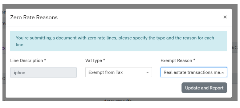 The user must provide a zero-rate VAT reason when submitting invoices to the authority.