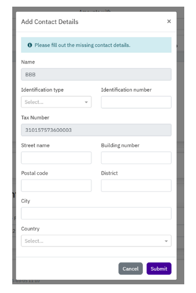 1- When clicking to share invoices to ZATCA , the system reviews the entries and verifies the contact details. If any key data is missing, such as the CRN, the system will prompt the user to add it before proceeding