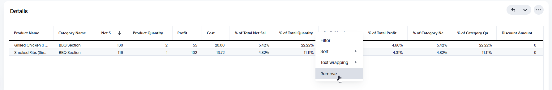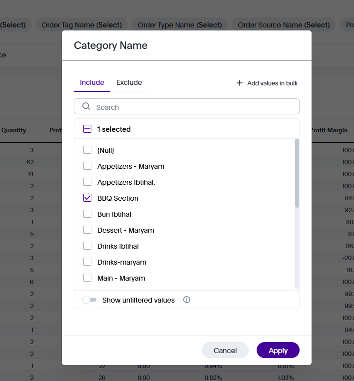 A pop-up will appear to allow me to select the name i wish to filter, I selected here the BBQ section Category name and the table will adjust accordingly