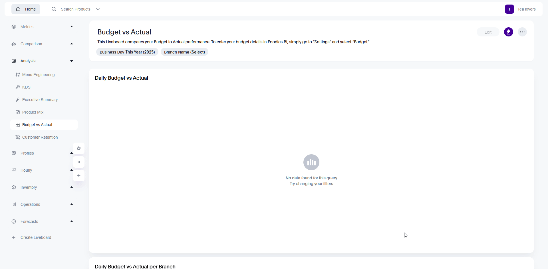 - Budget vs Actual: A comparison from the budget targets that was set and uploaded in the system vs the actual results and spending