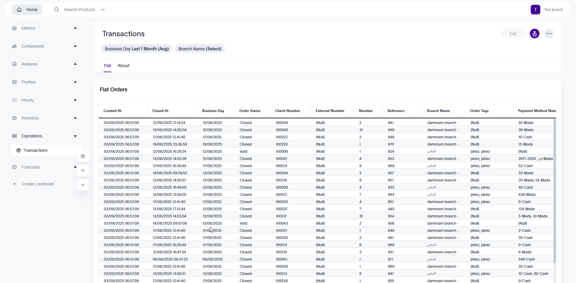In Foodics BI, the operations dashboard displays the list of all the transactions from your Console.