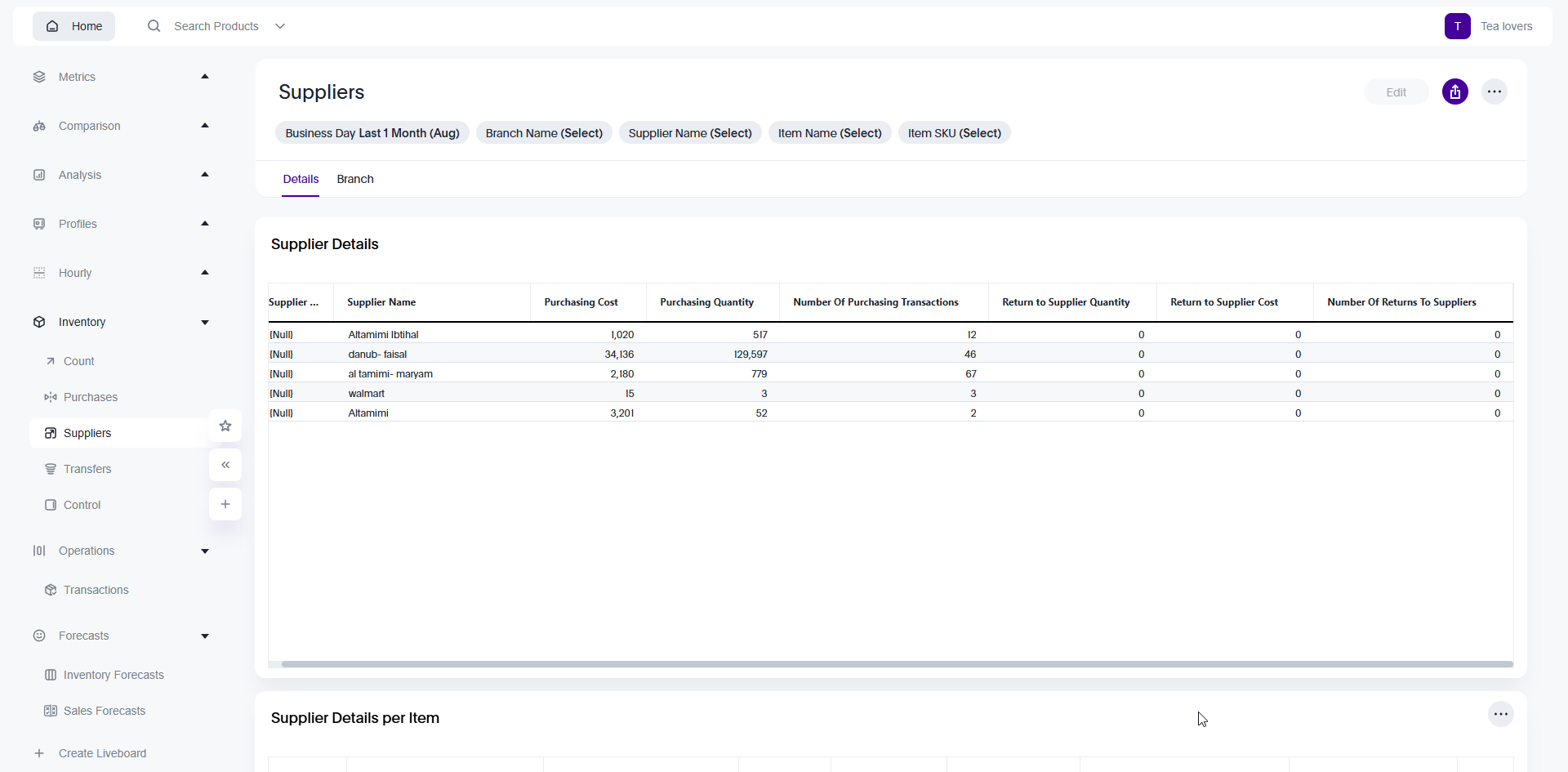 - Suppliers: Gives you an overview from which supplier you transacted with, the total purchasing cost, number of transactions, the returns, cost, number of returns.