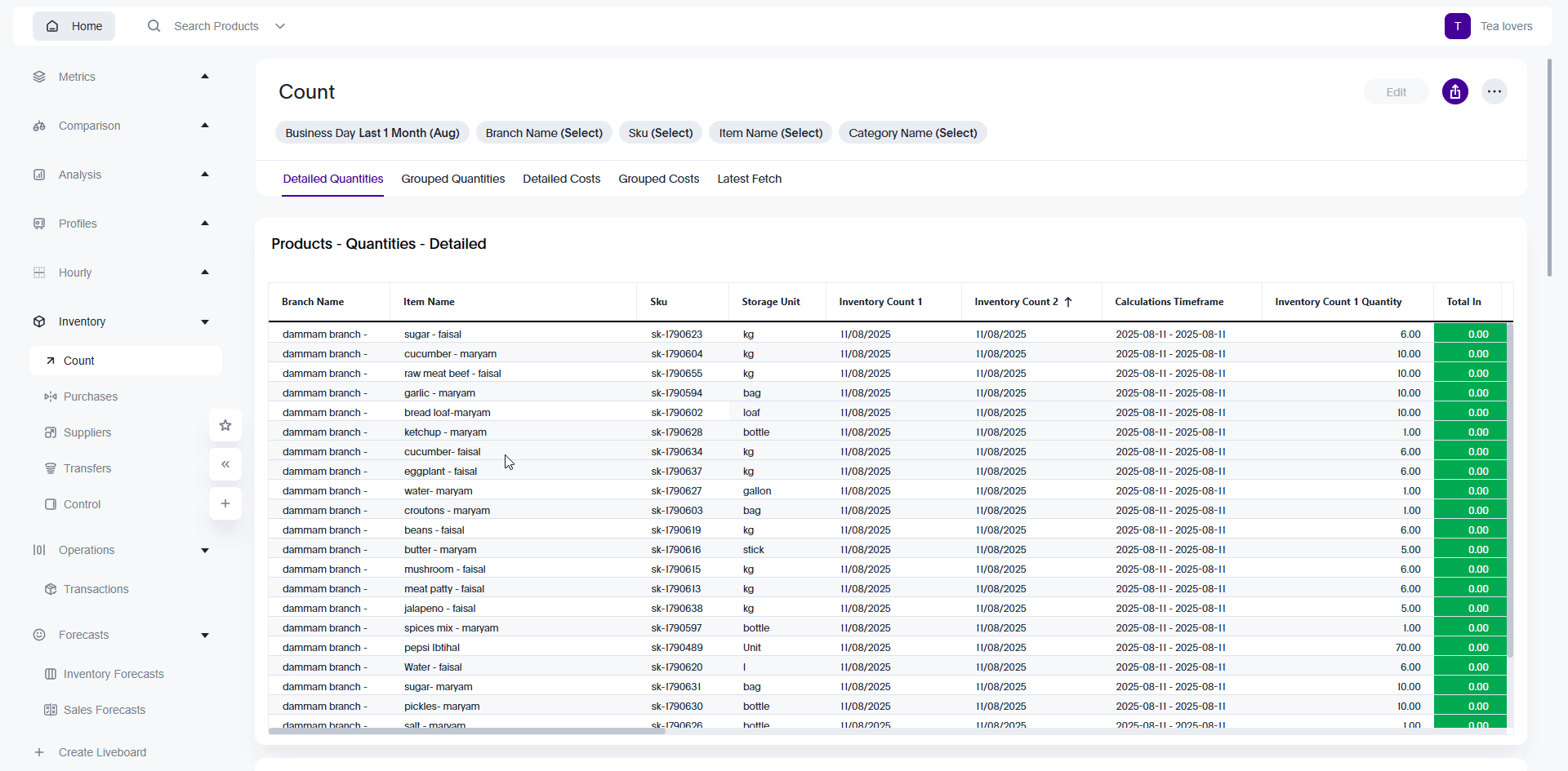 - Count: Here we have each inventory item, SKU, storage unit, date of inventory count and time frame of when it happened, What is the quantity change, The total in and out, inventory count actual vs theoretical, and the variance.