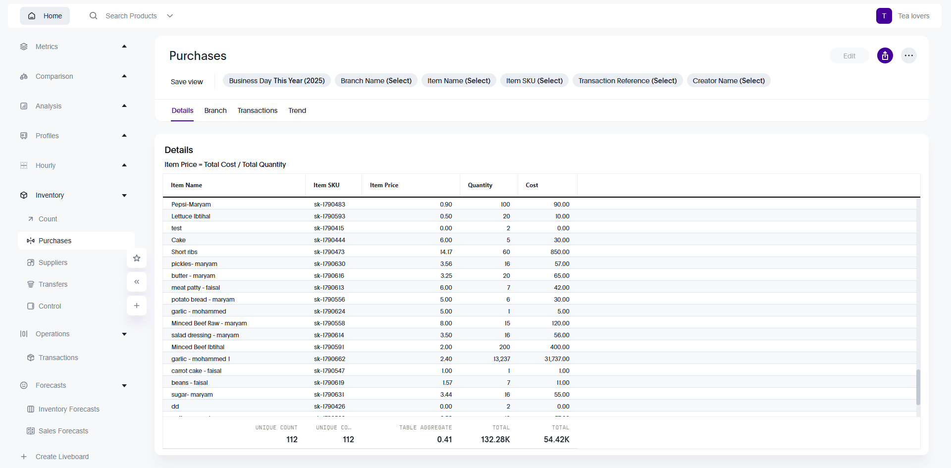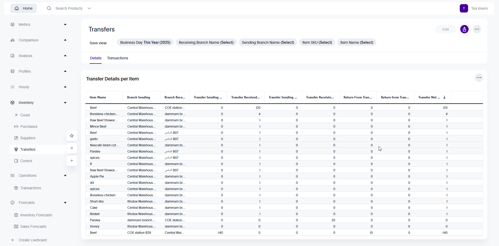 - Transfers: Same as the above, it will display the total transfer of an inventory item per branch and destination, how much was transferred out, actually received, Their costs, and any returns with a total net transfers at the end.