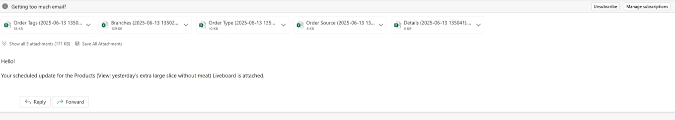- You should then based on the schedule get an email that looks like below with the attachments added to it