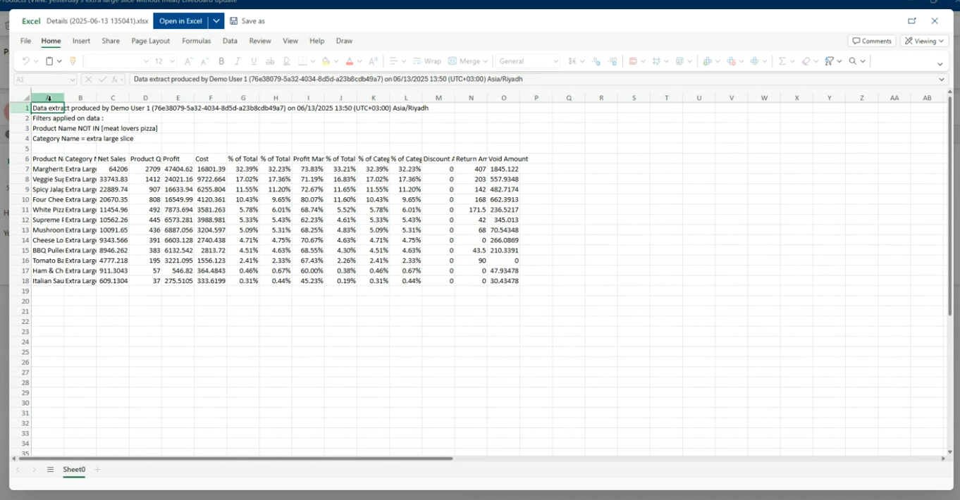 - If you open any of the excel, this would be the same data as if you went and downloaded the data out of Foodics BI. Same style of sorting