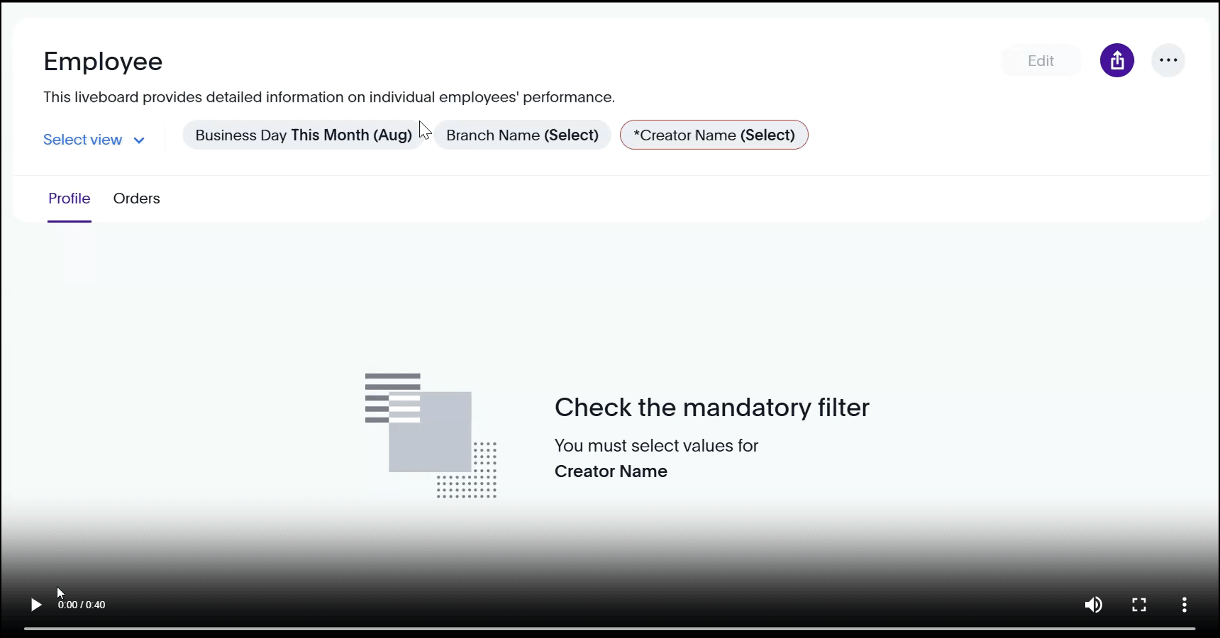 This quick introduction shows how to use the Employee dashboard. Creator Name is a mandatory filter, and you can also apply additional filters as needed. The dashboard provides an overview through two tabs: Profile and Orders.