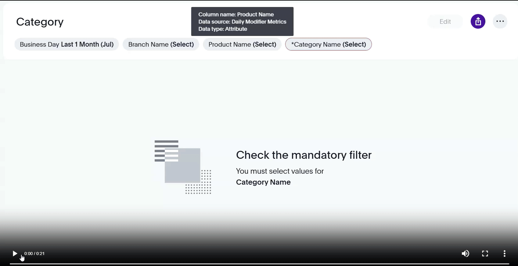 Here's a quick tutorial on how to use the Profiles > Category dashboard. You can add filters as needed, including Business Day, Branch Name, and Product Name. The Category Name filter is Mandatory !