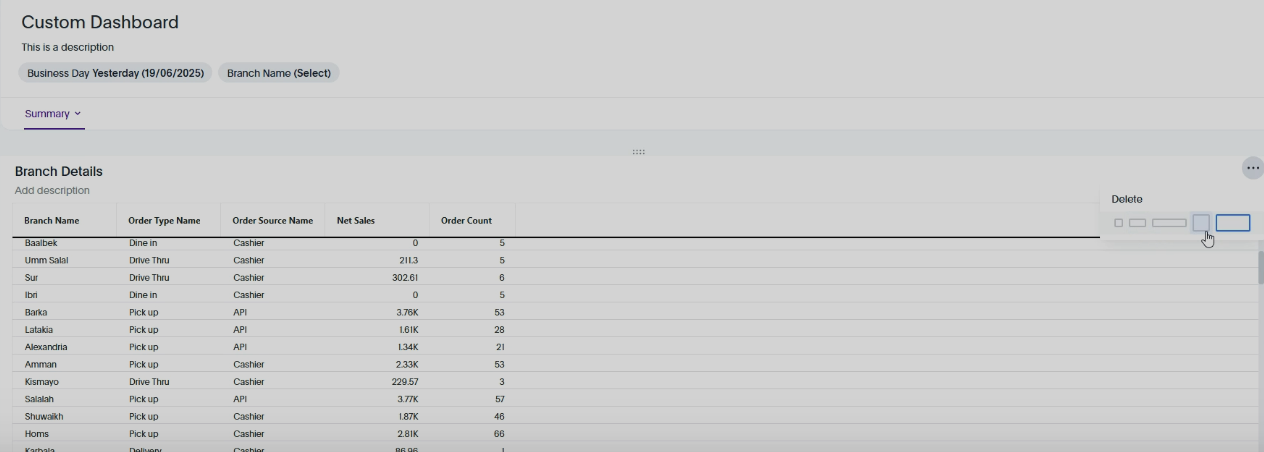 - Scroll to the charts and table area, here you can use the mouse to scale down or move the tables/charts about. You can also select default options by pressing "..." on the right side of the table/chart itself