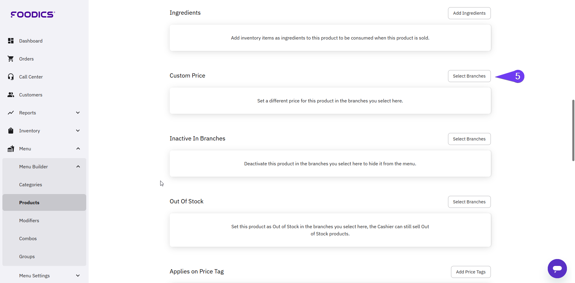 6. A pop-up window will open where you can choose branches and assign different prices for your product.