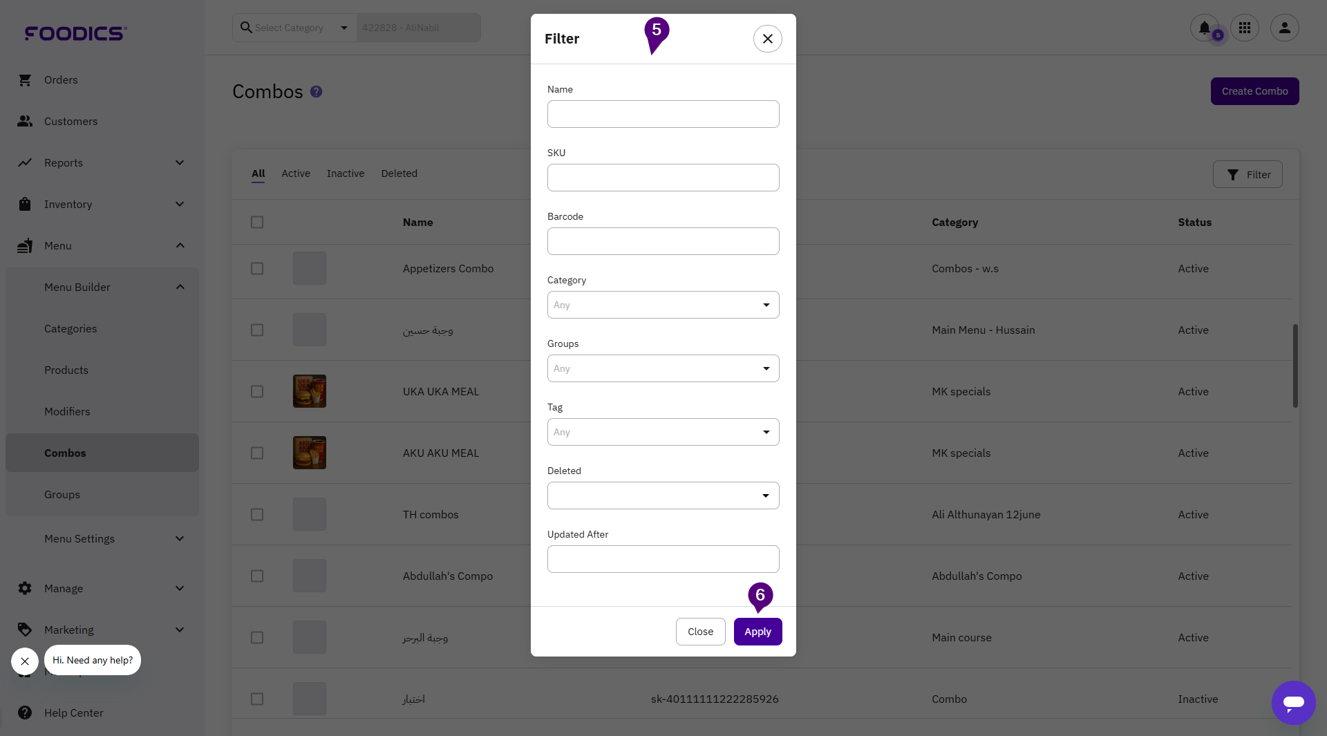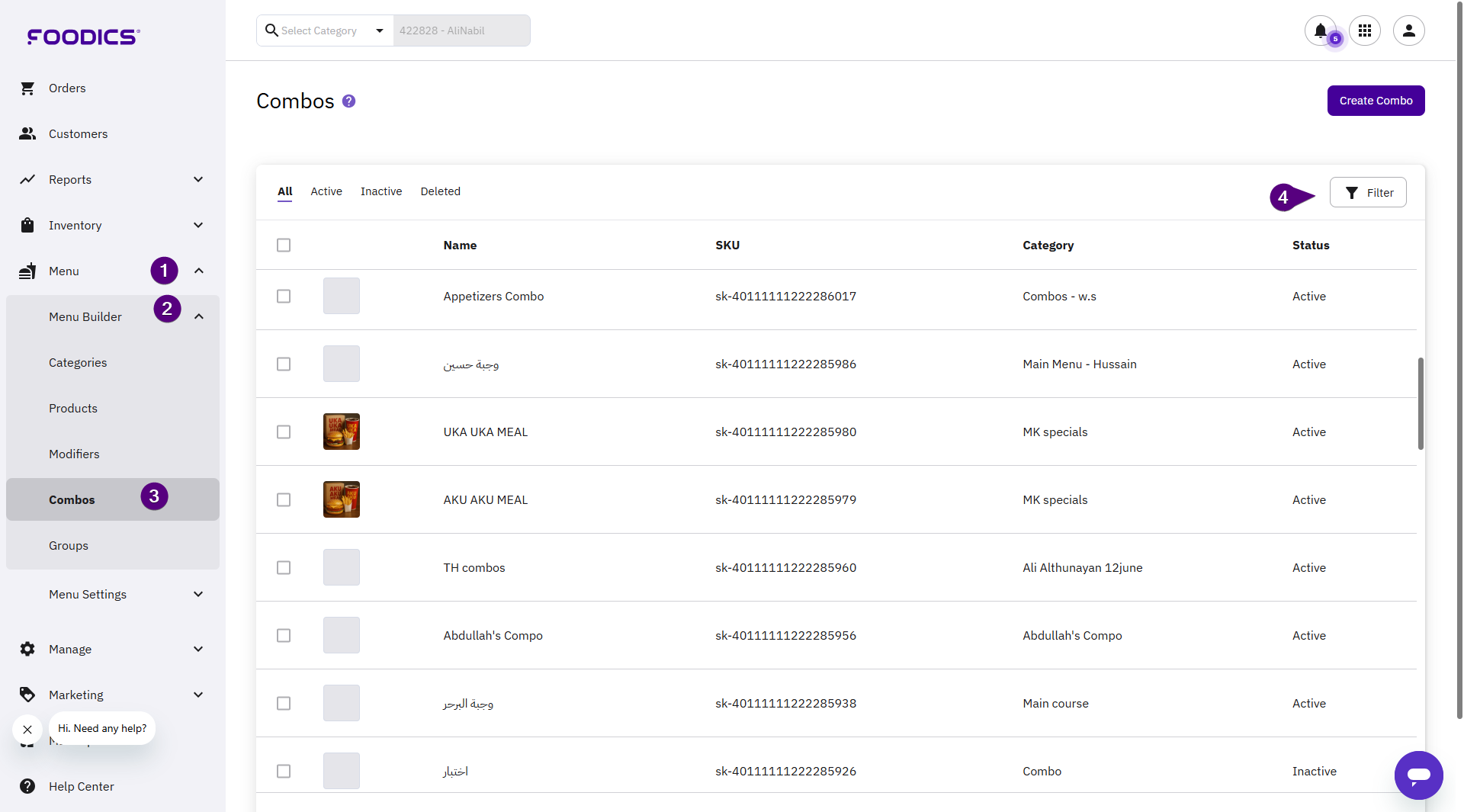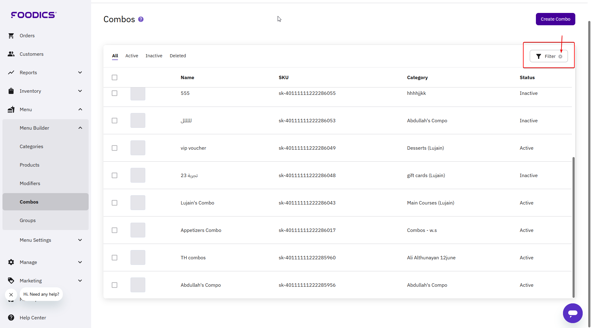 An updated list of combos will show based on your entered criteria. To return to the original list of combos, click the X mark in the Filter button.