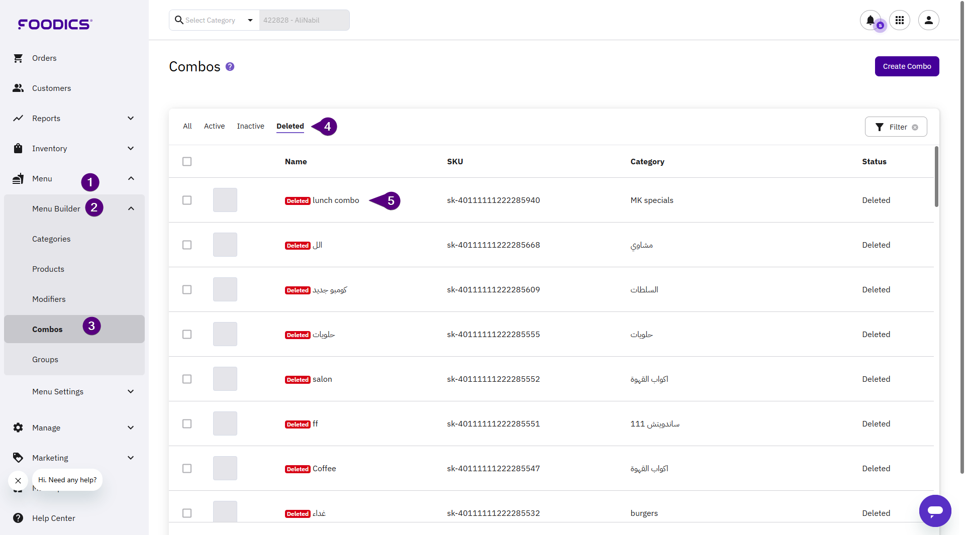 4. Click the Deleted tab to show a list of deleted combos.