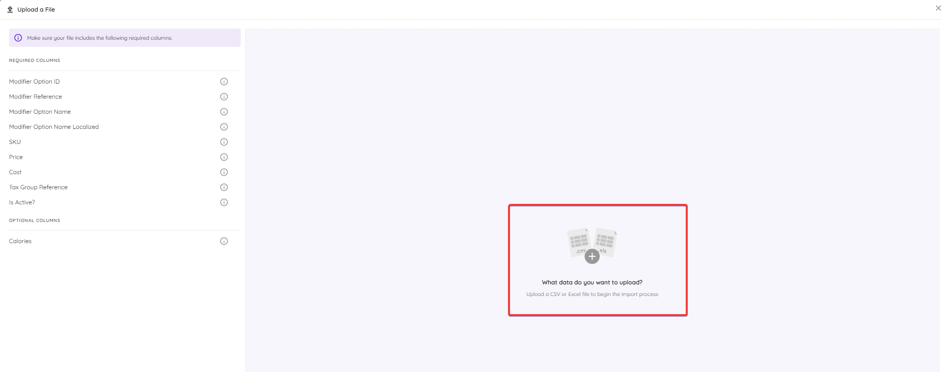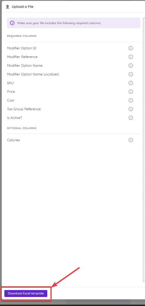 Instead of adding modifier options one by one to the system, you can save your time and work more efficiently by filling a ready-made table with all types of options you already have and uploading it to the system.