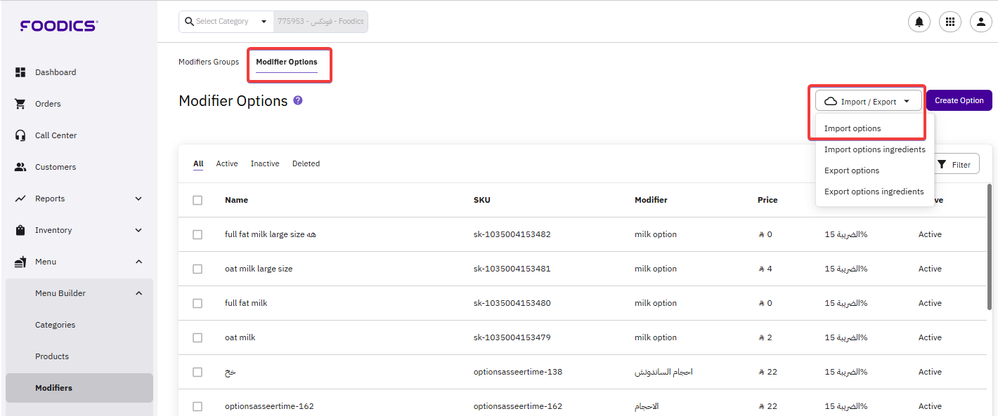 - modifier_reference: Unique code for the modifier to which the option belongs (You can get it from modifier page details, click here for more information).