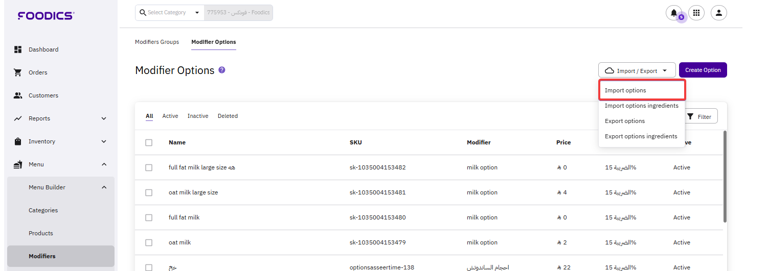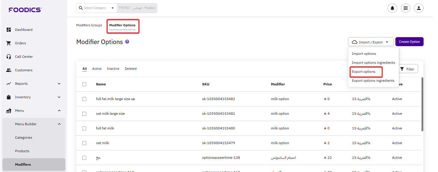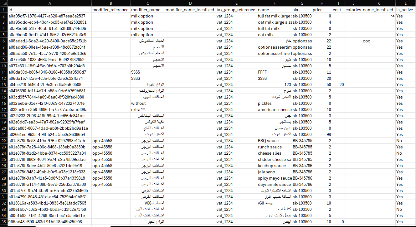 After having many modifier options filled with details, you may like to introduce bulk changes to these options. Instead of changing them one by one through the system, you download the list and make the changes, then import your CSV file again to the system. To download the file: