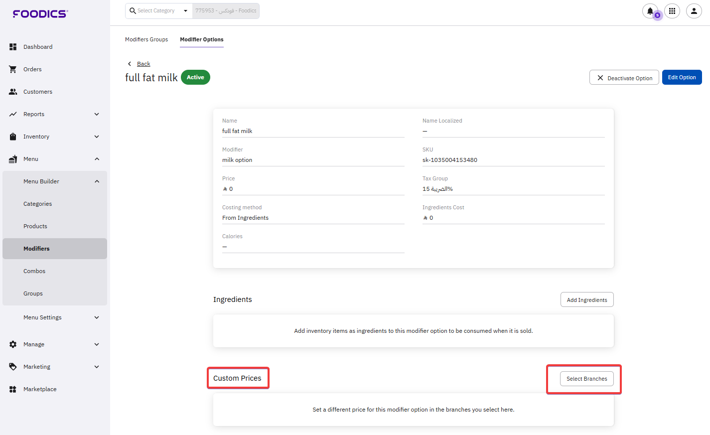 While the usual scenario for modifier options is to have the same price everywhere, setting a different price for certain branches may be a better strategy to take the context of your branch into account, such as your branch inside the airport or in luxurious malls.