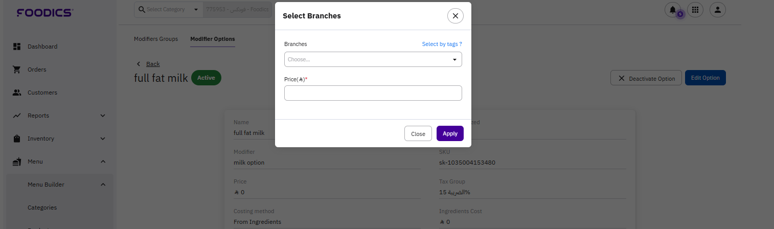 7. A pop-up window will open where you can choose branches and assign different prices for your modifier option.