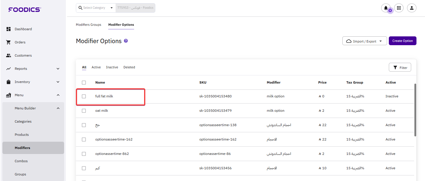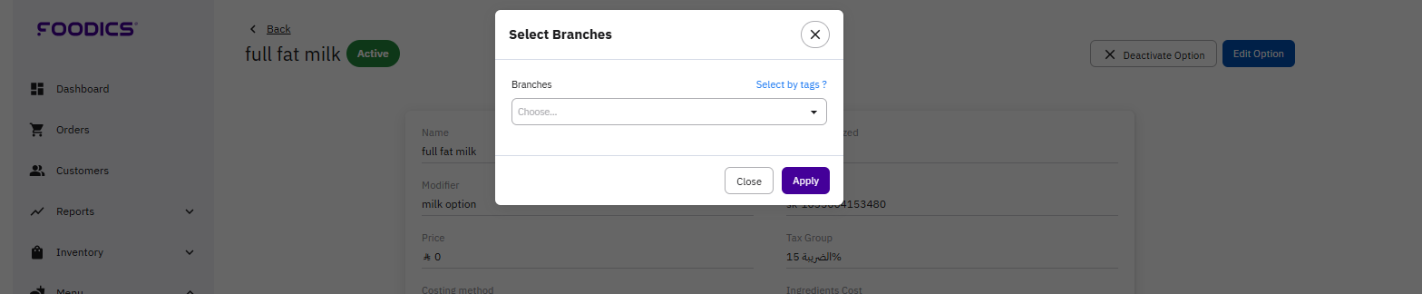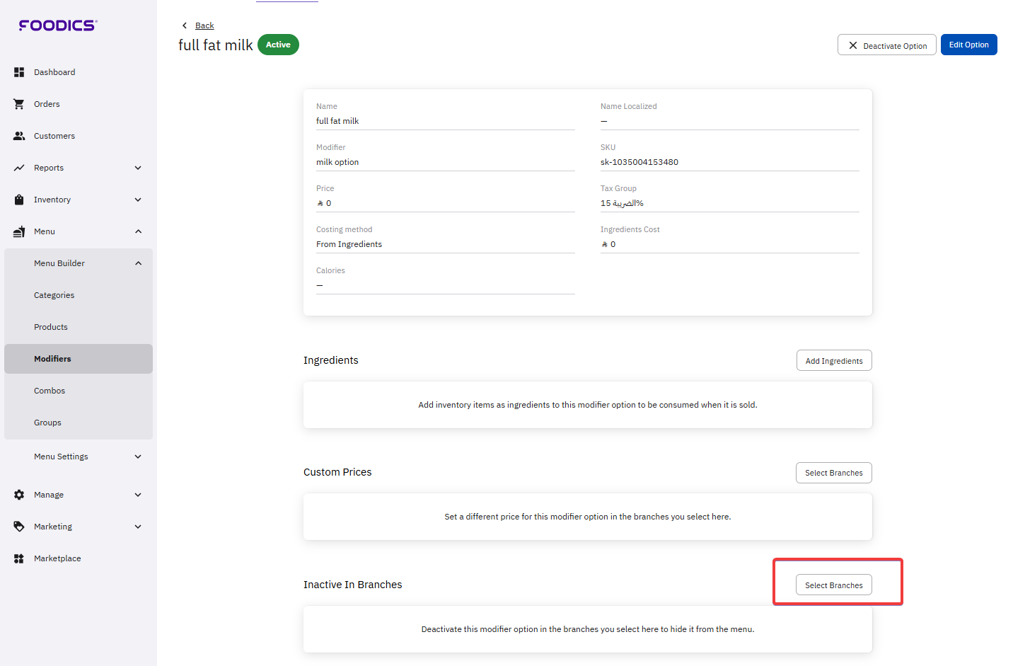 7. A pop-up window will open where you can choose branches where your modifier option will be deactivated.