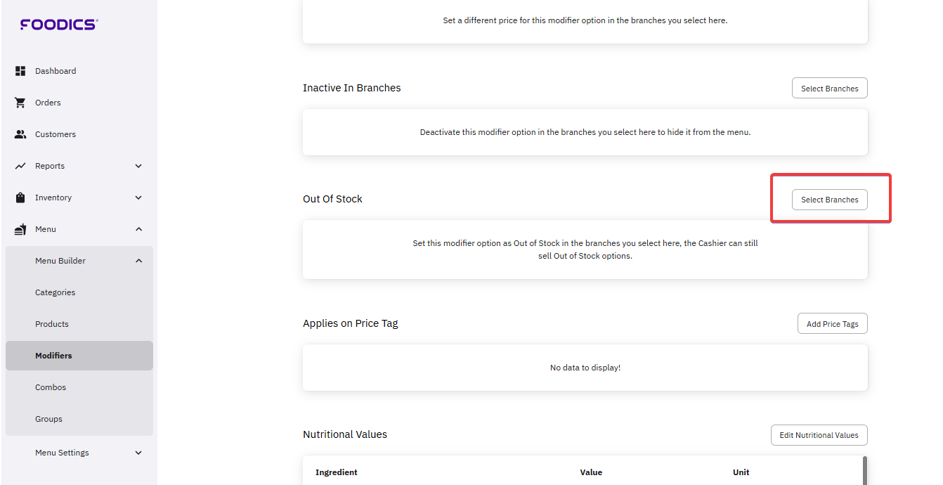 Setting Some Modifier Options as Out-of-Stock in Some Branches