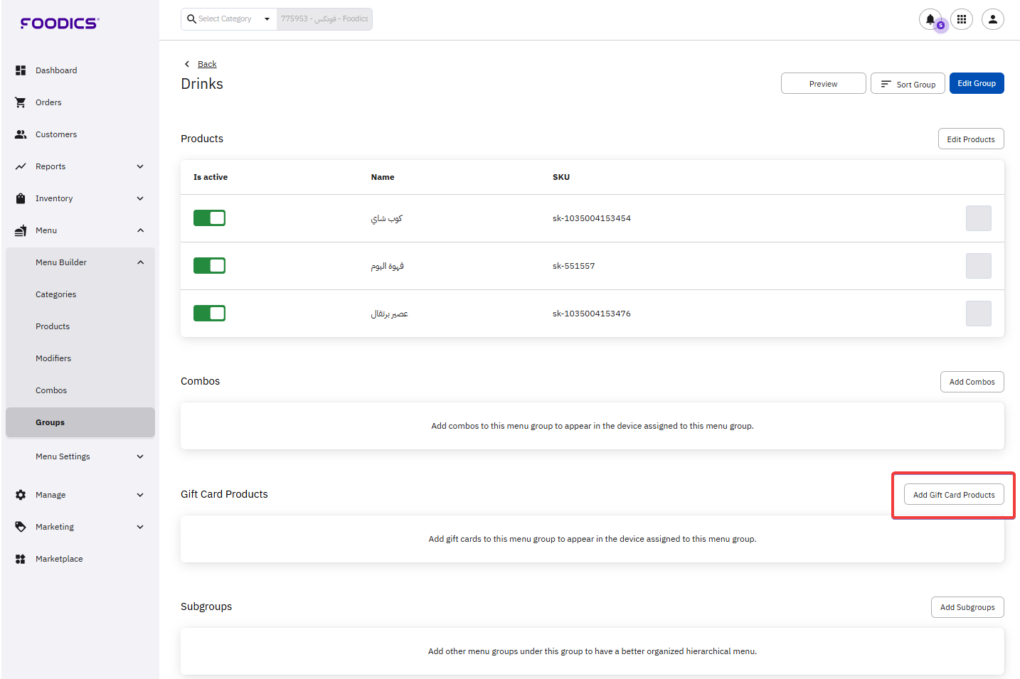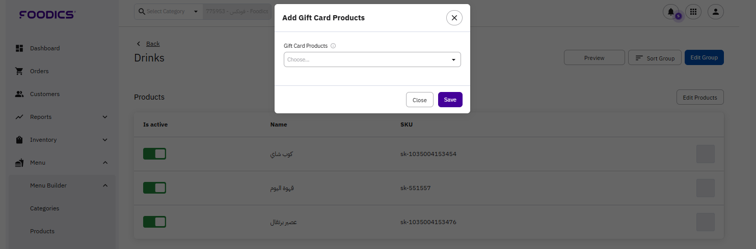 You can add gift cards to multiple menu groups, for example to Breakfast and Delivery menus, so that it becomes sellable in all suitable locations.