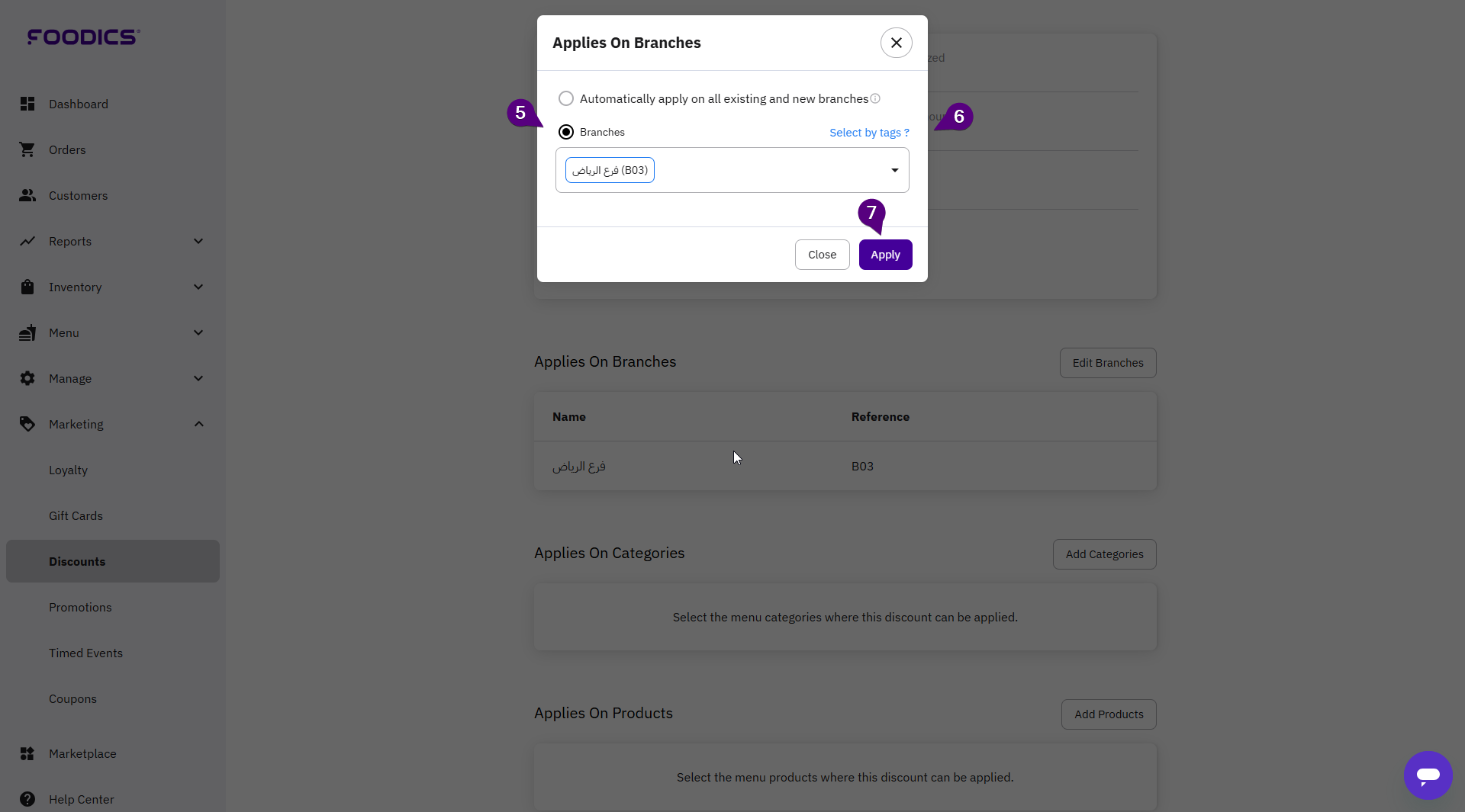 5. A pop-up window will open where you can select the branches where you want the discount to be applied.