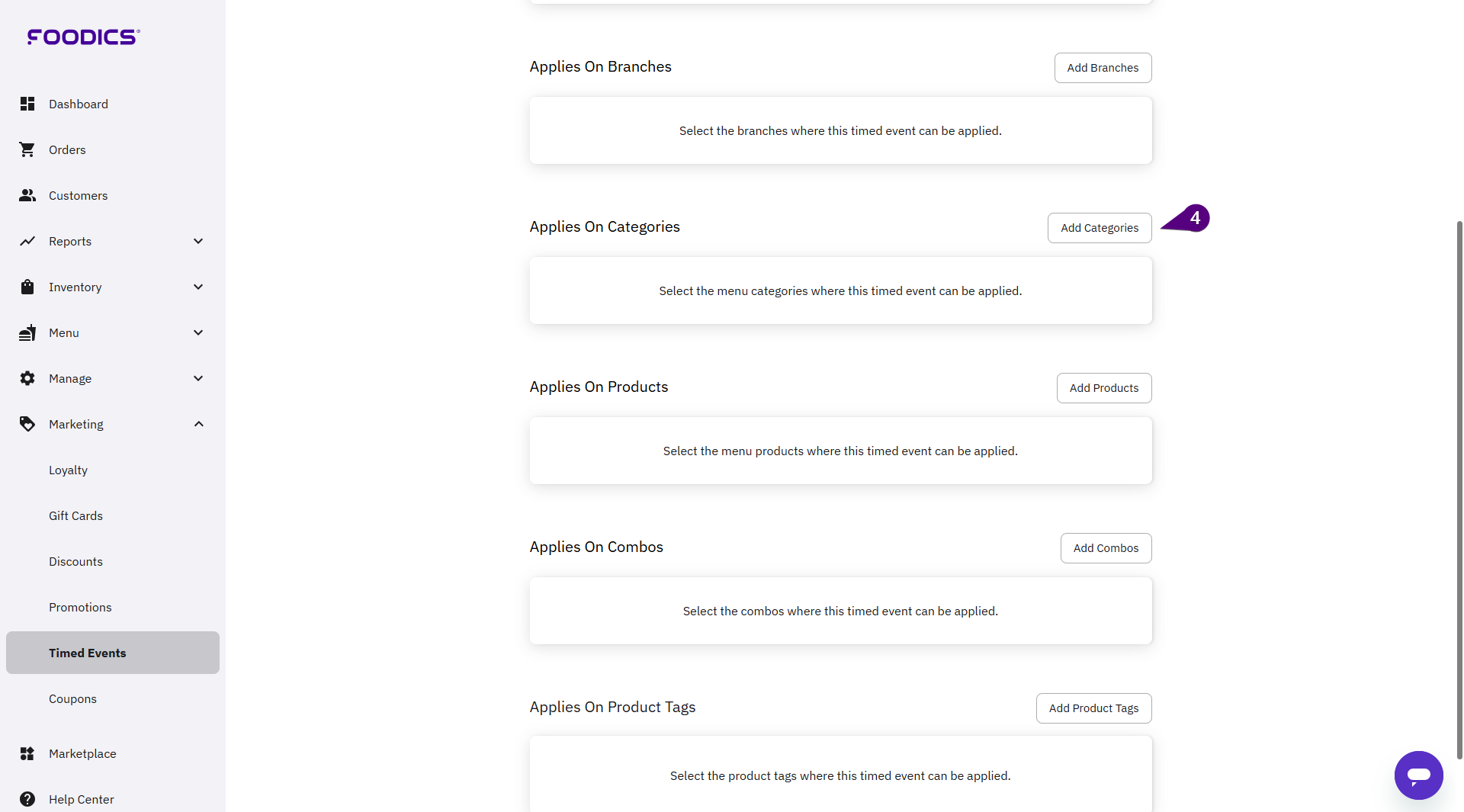 5. A pop-up window will open where you can select the categories for which the timed event is applicable.