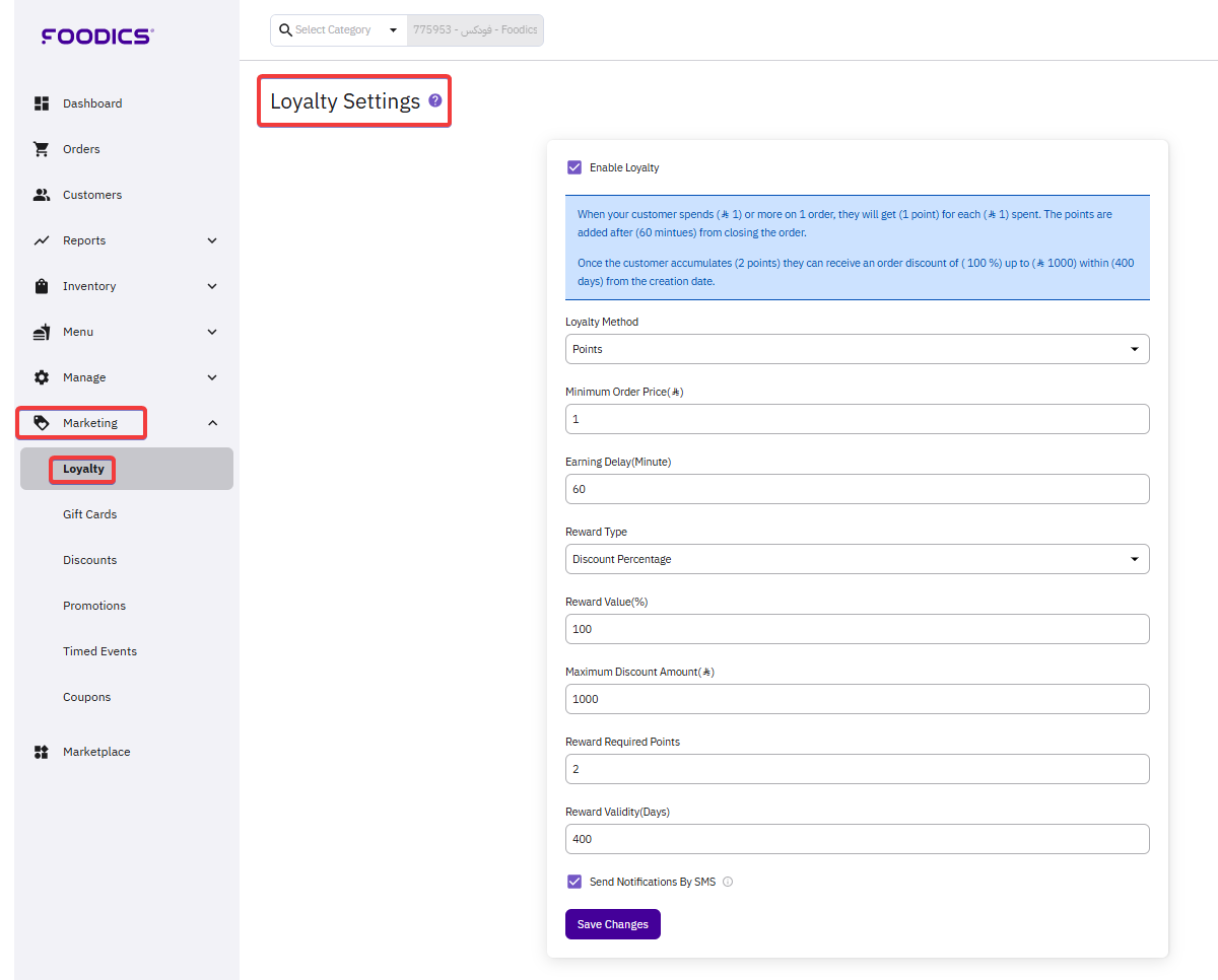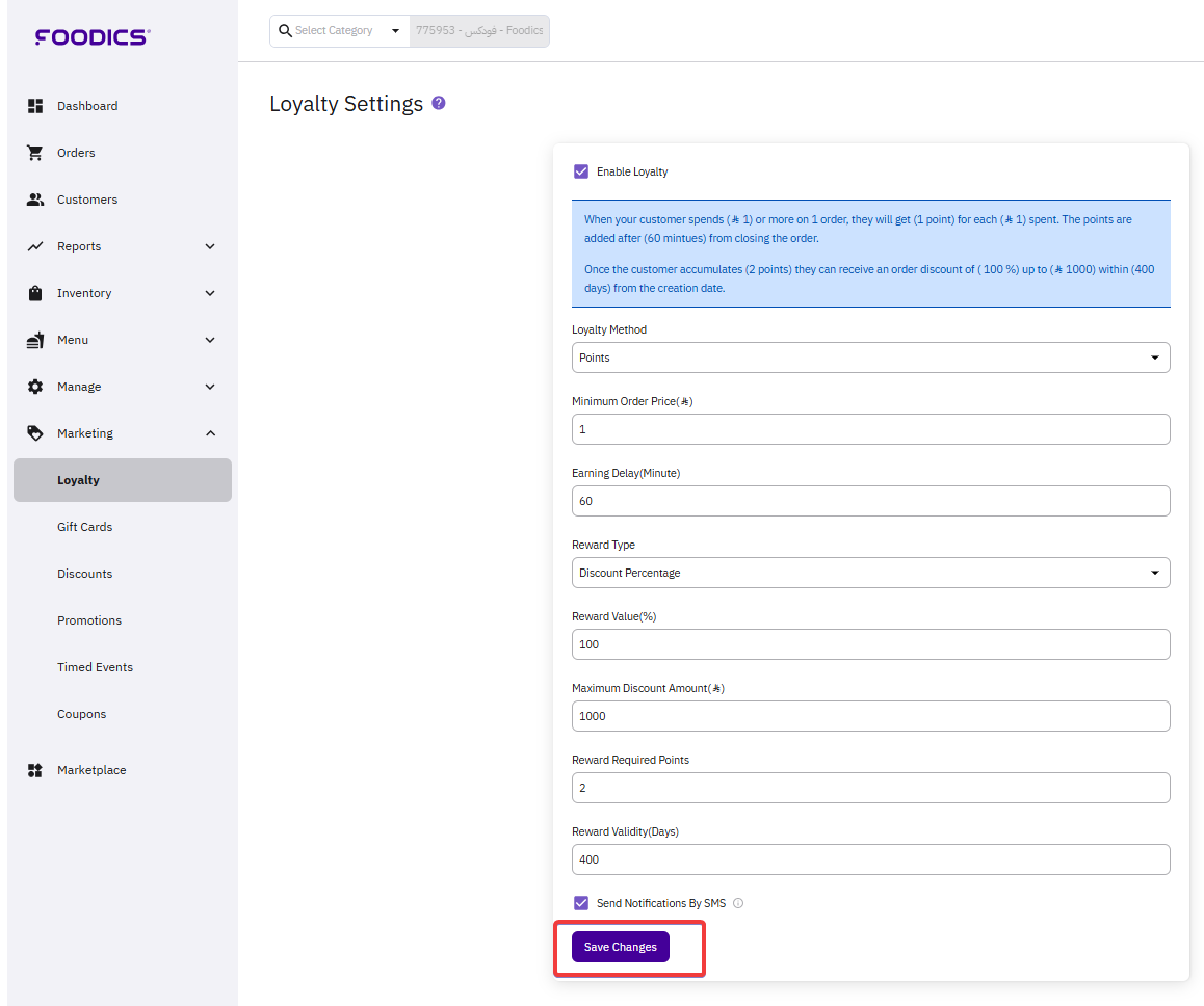 - Send Notification By SMS: Check this box if you want to send loyalty notifications to the customer by SMS (In order to be able to use this feature, you need to subscribe and integrate with SMS provider. Click here to learn more about it).