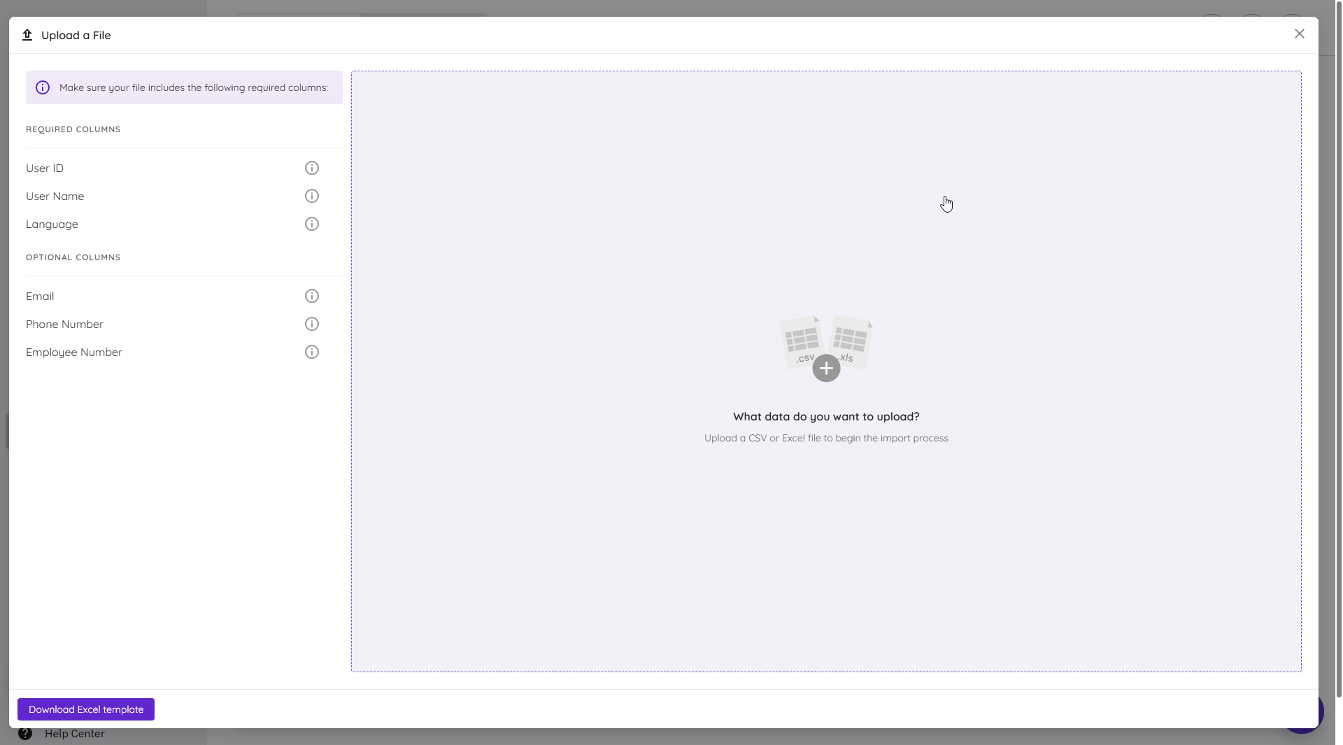Instead of adding users one by one to the system, you can save your time and work more efficiently by filling a ready-made table with all types of users you already have and uploading it to the system.