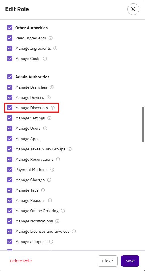 Once this permission is enabled, the Discounts section will appear, and discounts can be managed normally through the Console.