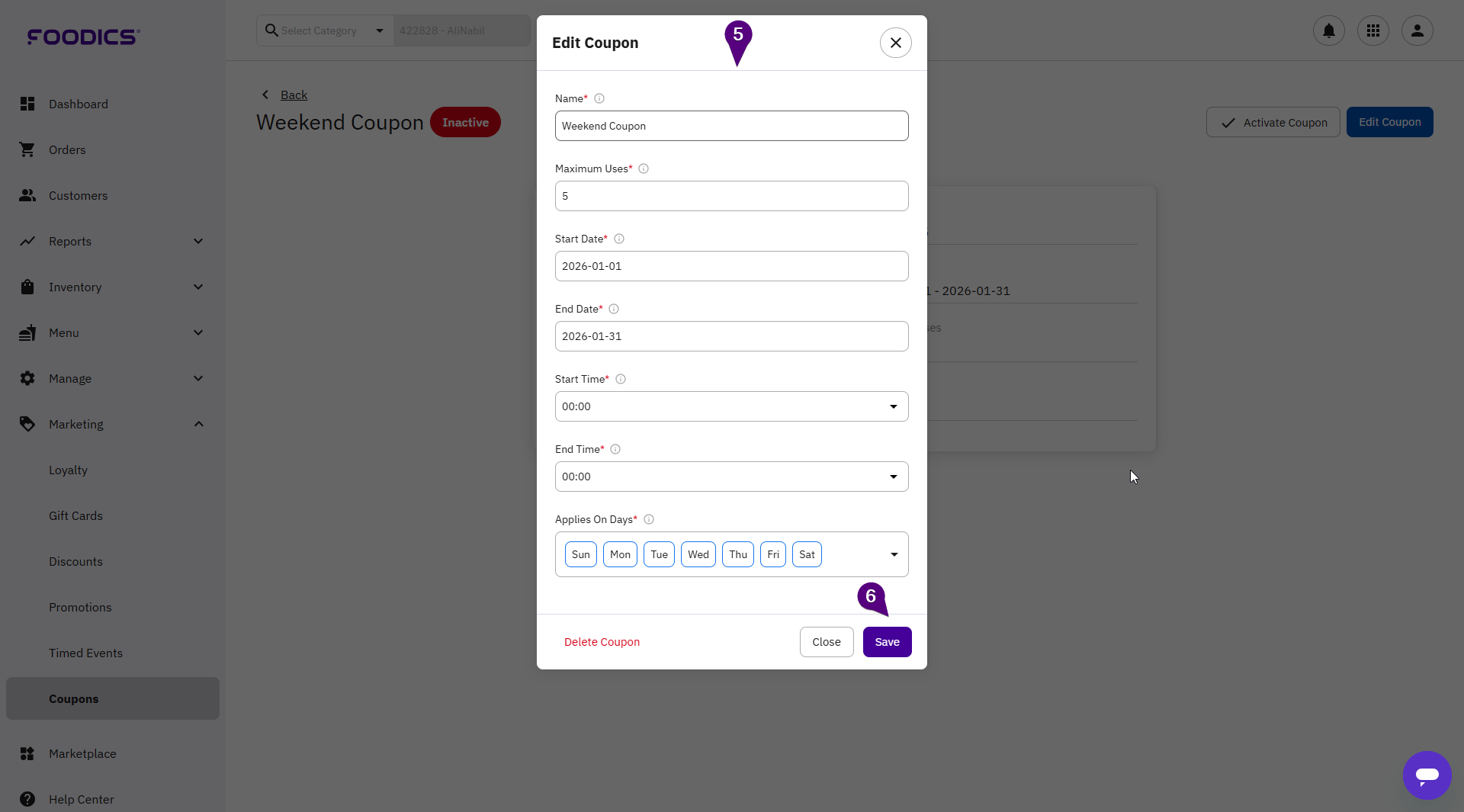 - Applies On Days (obligatory field): Enter the days on which the coupon can be used.