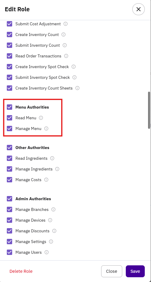 Once this permission is enabled, the Menu Groups section will appear, and menu groups can be managed normally through the Console.