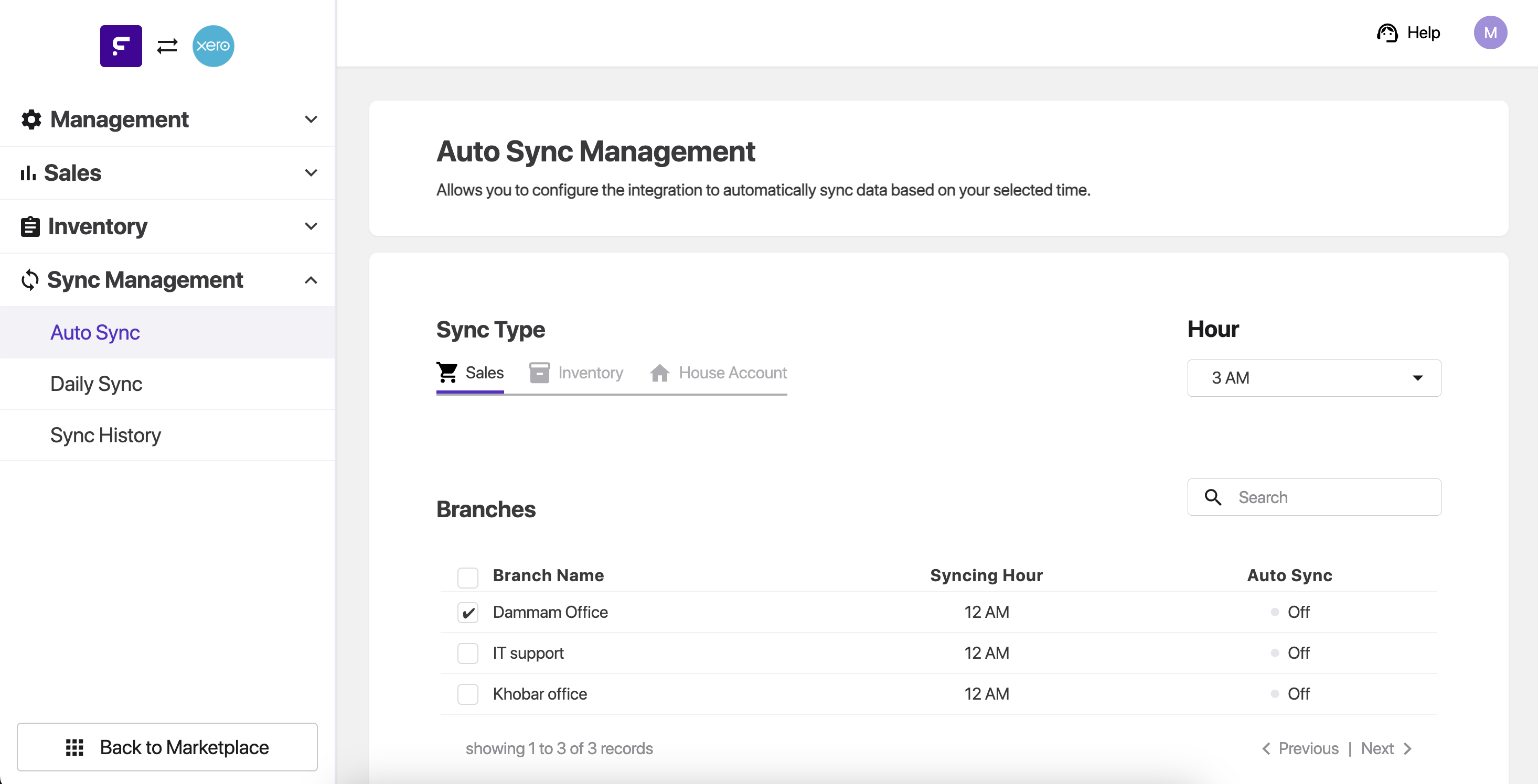 The sync is divided into there sections, Sales Sync, Inventory Sync, and House Account Sync