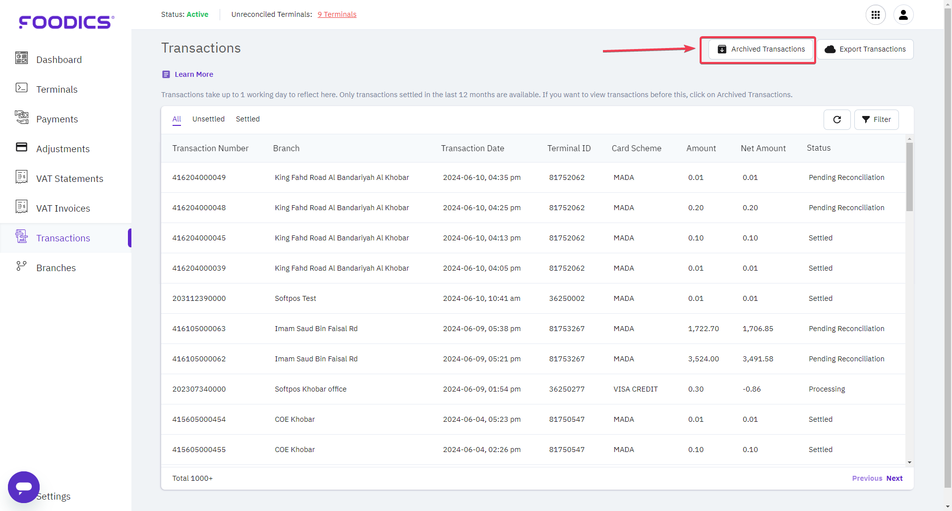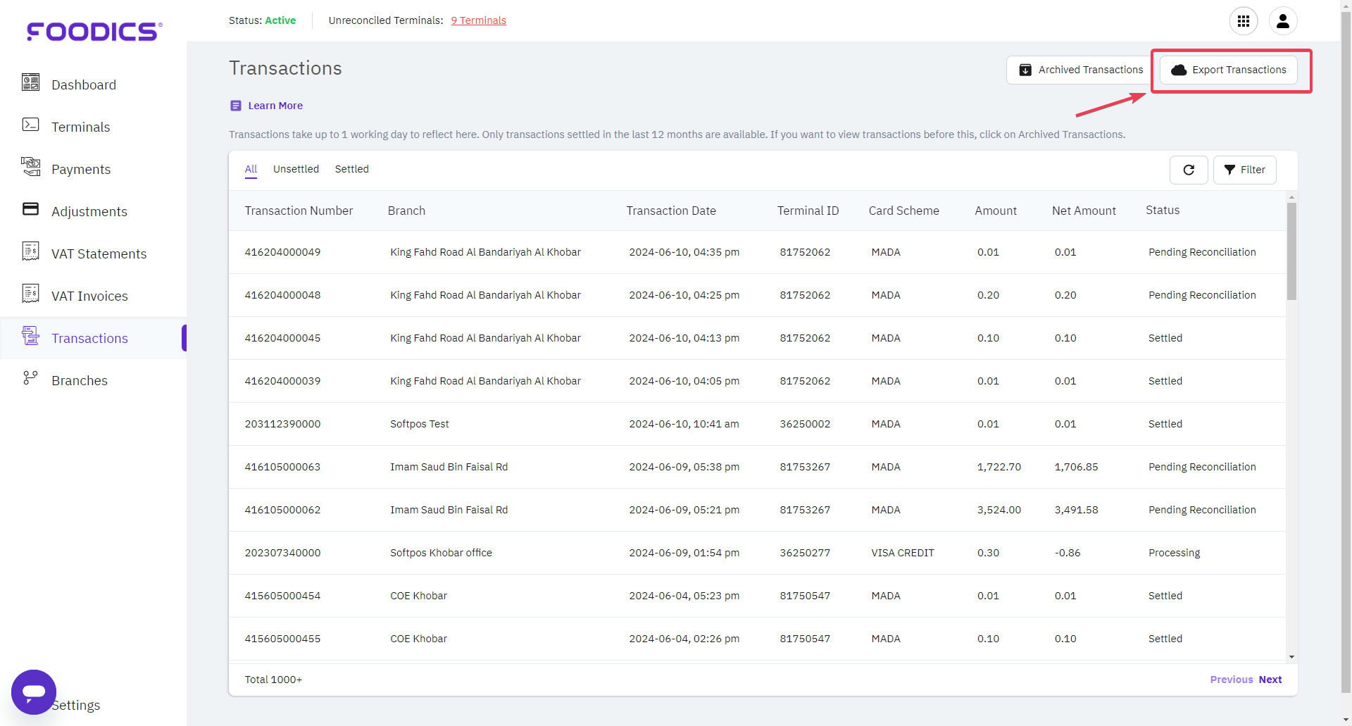 The transactions will be updated directly on the portal after Foodics receives the information from the bank which may take up to 1 working days. So, when you are comparing the receipt and the transactions on the portal and you find missing transactions, kindly wait up to 1 working day at minimum before you reach us.