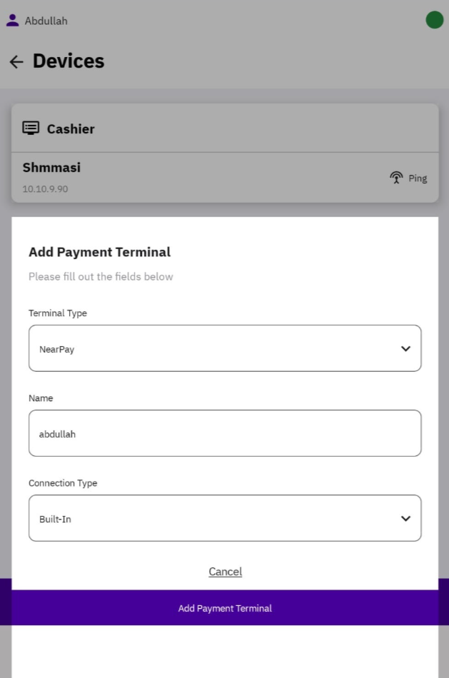 6. Select “NearPay” for Terminal Type, Add the name, connection type should be Built-in, then press on Add Payment Terminal.